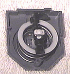 | Dangling connector. I'm told that it is an optic connector. Don't mess with it, and don't get alcohol or lubricant on it! | Light half of joystick box. Consists of one light grey shell, a white box with two notched black disks attached, and a small black curved swingy thing that rests inside the white box. | Dark grey half of joystick box. Consists of one dark grey shell, metal spring, white plastic ring, plastic joystick, and a small black curved swingy thing that serves to lock the mess together. |